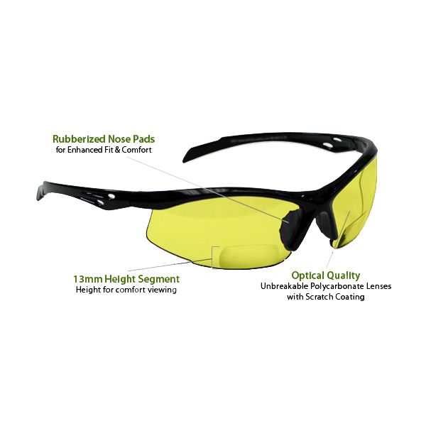 Stylish bifocal safety glasses have become a big market, and users are asking for more choices in frame styles. The contemporary design and modern flair, but the wraparound lens offers a close fit and comfortable protection. A rubber nose bridge and soft rubber tipped temples make this frame style one of our most versatile.