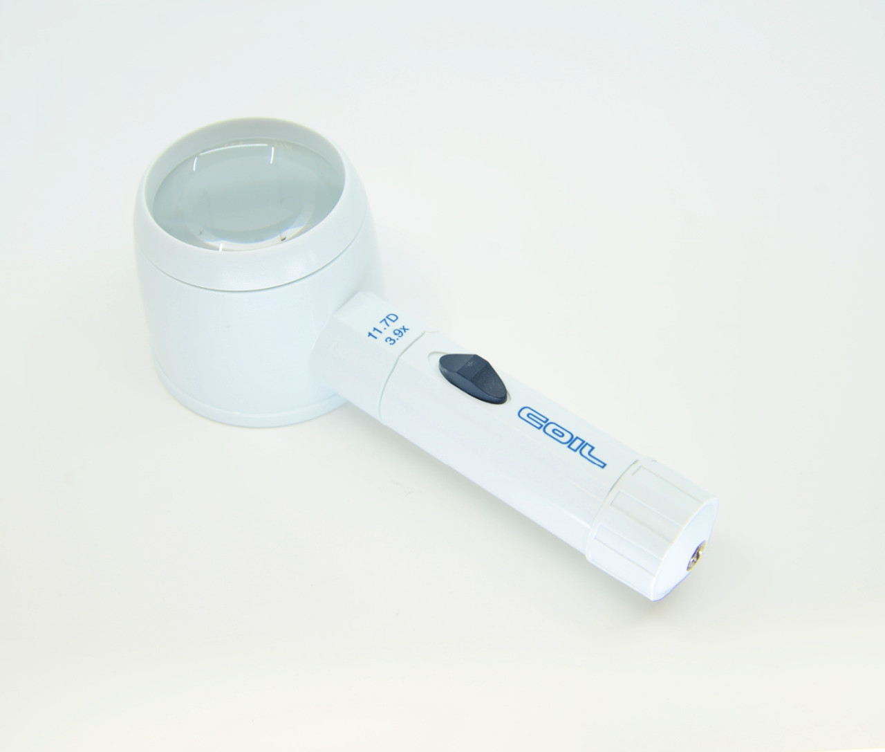 3.9X/11.7D. Hand-held magnifier (lens size: 58mm or 2 1/4 inches in diameter) with built-in light provides shadow-free and reduced-glare illumination. It has a fixed focus so it lays directly on the printed material. This Electric Xenon magnifier by COIL offers the high quality standard aspheric lens of the Raylite series. COIL Raylite Stand Magnifiers provide excellent distortion-free images and can help ease daily reading tasks for low vision individuals. Xenon illumination has a high brightness white color bulb.
