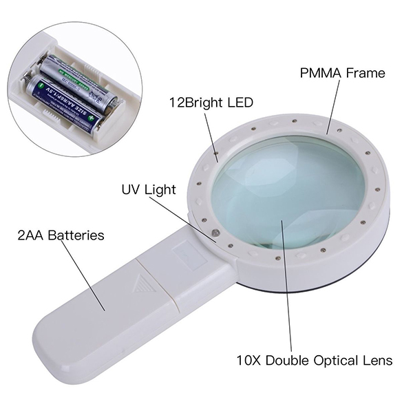 Equipped with 12 energy-efficient LED lights built in the handle. The lights provide an evenly lit viewing area, perfect for nighttime book reading and use in low light applications. The lights run on 2 AA batteries, which can last for weeks.