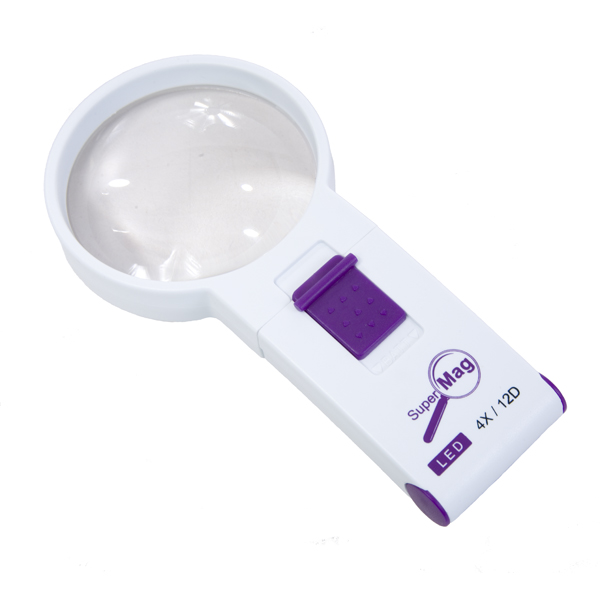 The SuperMag 4X/12D power LED handheld magnifier is the finest in the industry and is a must have for anyone with reduced vision. Use the magnifier on newsprint, books, magazines or photos for crystal clear viewing. The LED bulb provides extra light when necessary and never needs replacement. The magnifier measures less than 6 inches in length and can be comfortably used at home or tucked into purse or briefcase for on – the – go magnification. It really comes in handy for those long trips! The magnifier comes in its own soft vinyl drawstring carry case and storage/gift box.