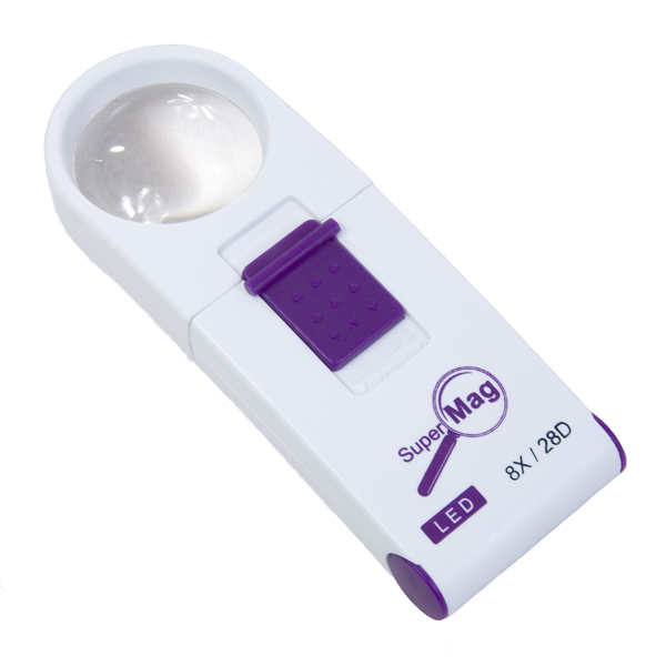 The SuperMag 8X/28D power LED handheld magnifier is the finest in the industry and is a must have for anyone with reduced vision. Use the magnifier on newsprint, books, magazines or photos for crystal clear viewing. The LED bulb provides extra light when necessary and never needs replacement. The magnifier measures less than 6 inches in length and can be comfortably used at home or tucked into purse or briefcase for on – the – go magnification. It really comes in handy for those long trips! The magnifier comes in its own soft vinyl drawstring carry case and storage/gift box.