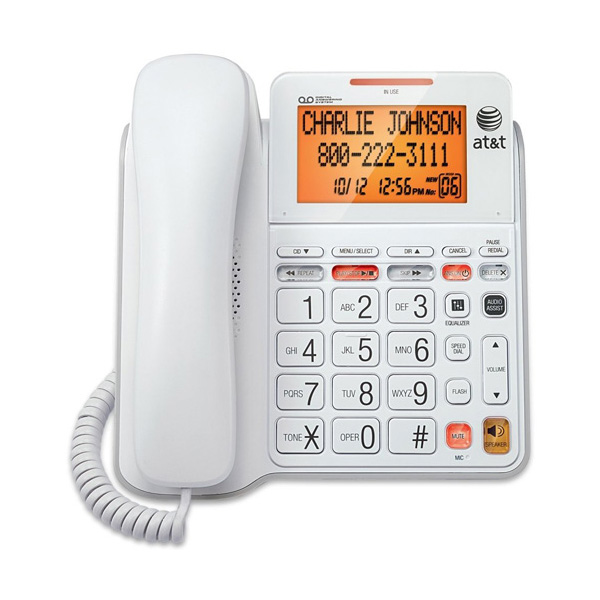 AT&T Corded Speakerphone with Digital Answering System, Caller ID, Call Waiting And Tilt Display. 19 minutes of recording time with remote access, time/day stamp and Message Guard® memory for power failures. 65 name/number caller ID (activation required). 10-number memory. Extra Large buttons and hearing aid compatible. Hands-free speakerphone with volume control. Tri-lingual setup menu – English, Spanish, French. No Batteries Required. Includes mounting base.