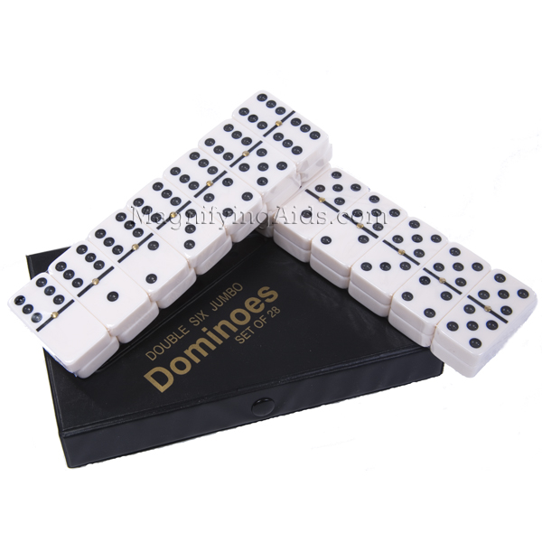 These very large dominoes have a high contrast black on white design, and the dots are indented for tactual identification. The one piece plastic box has a built – in spinner to help you mix the tiles. Each of the 28 Double Six dominoes measures 1 x 2 inches.