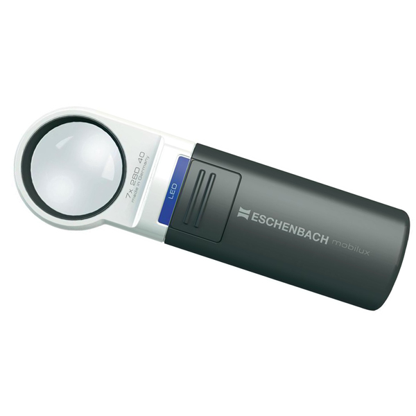 The 7X Mobilux LED Illuminated Eschenbach Pocket Magnifier is designed to be a Portable Magnifier and is powered by 2 standard AA size batteries. The LED bulb of the Lighted Magnifying Glass has an unlimited life so no bulb changes are required together with a 10x longer battery life. This item code of 15117 replaces the previous item code 151074. The Hand held illuminated magnifier has a large easy-to-use switch and removable lens case provides optimum protection for the lens.