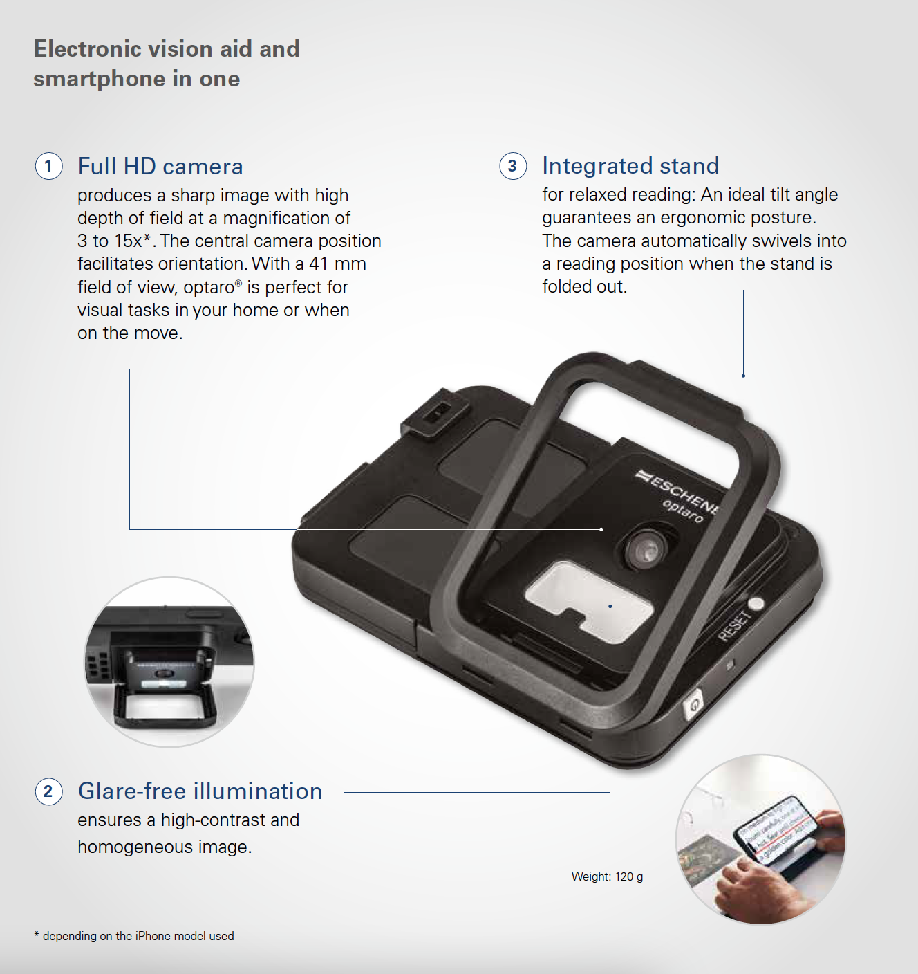 The Optaro® is the first video magnifier specifically made for a smartphone. It easily attaches to an iPhone turning two devices into one. By downloading the free app, it allows the iPhone to communicate with the Optaro® camera, turning the phone into a full-featured video magnifier.