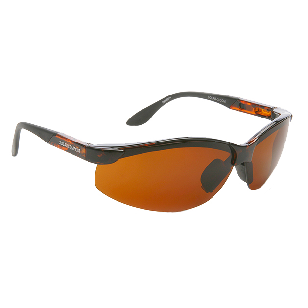 All SolarComfort® filters block 100% of UVA/UVB rays and are made with bend-to-fit temples for a custom fit. Frames are made of lightweight nylon 66. The tinted lenses block visible light in the following wavelengths: gray and plum lenses (400nm); yellow (450nm); amber (511nm); orange (521nm).