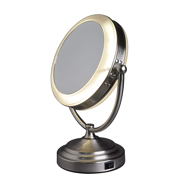 Daylight Cosmetic Mirror – 8x Magnification and 1x Regular. New, bright, glare-free cool lighting. Bulb lasts 1000’s of hours and is easily replaced. Adjusts to any viewing angle. Includes mirror and instruction manual. Brushed Nickel.