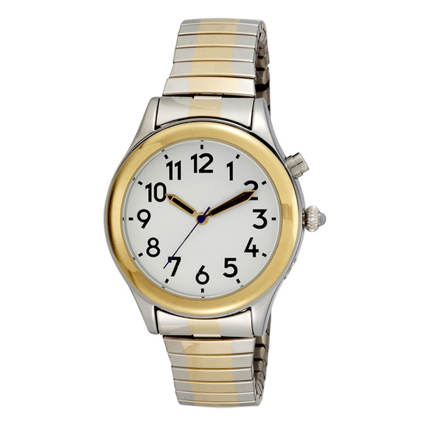 This is a true quality and elegant looking Ladies two tone talking watch. While it has only one button, this watch announces the Time, Day and Date, Year, and has an Alarm. Very simple to set and even easier to use.