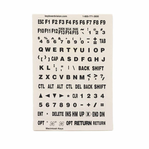 A set of stick on large print letters that allow you to convert your existing standard keyboard into an easier to see keyboard.(Black letters on a beige background).