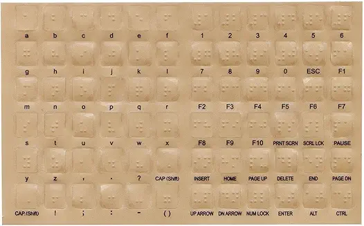 This comprehensive set of 72 overlay stickers has raised Braille markings and includes all letter and number keys, as well as most of the common function keys (F1 through F10, Escape, Home, Insert, Control, Alt, Delete, etc.) Includes overlays, easy application instructions, and burnishing tool to aid in application.