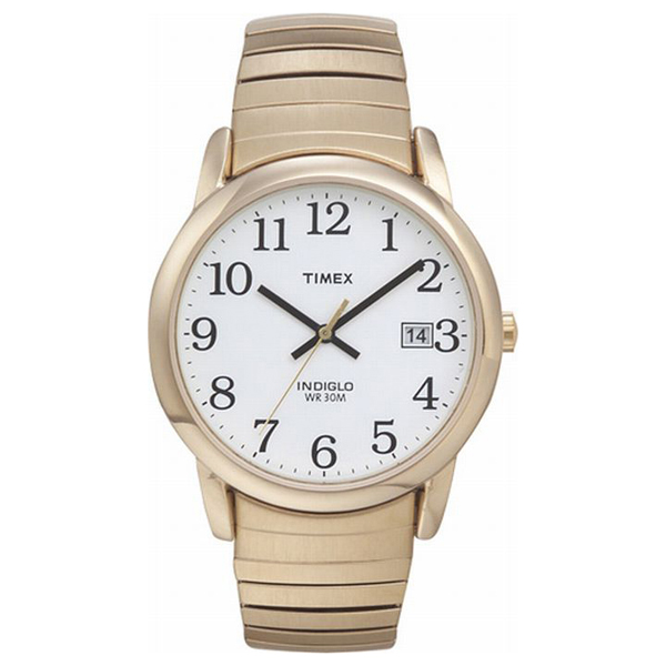 This large black number man’s watch has a 1.50 inch diameter face with crisp, black numbers. It features a gold tone case with gold expansion band. Water resistant to 30 meters.