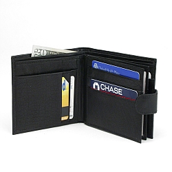 This men’s wallet includes: 12 credit card slots, 2 paper money holders, 2 windows for an ID or driver’s license and one slot for money. A snap keeps the soft, black leather wallet closed. Measures 4.5 x 3.5 inches.