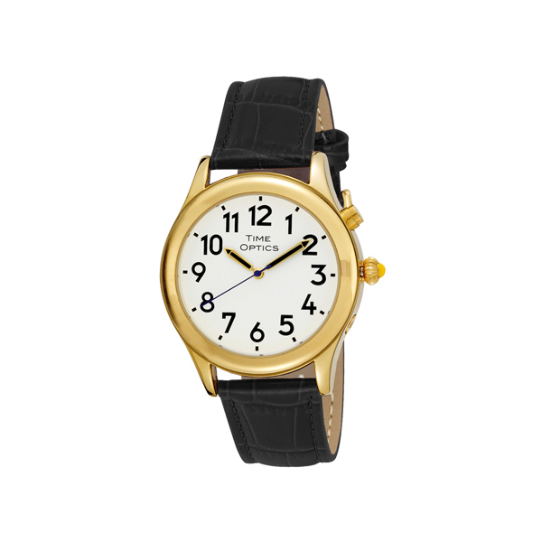 Our Man’s Talking Watch,Gold Tone, with Genuine Leather Black Croco grain Strap, is a timeless piece that is classic and stylish. Our Unique Dual Voice (male or female) Talking Chip with Alarm Feature is unique to our Time Optics Brand. The Black textured Croco Grain Genuine Leather Strap only adds to the beauty of the watch. The clean white dial with the black bold numbers and sapphire blue second hand make it easy to read, and our over-sized Pumpkin Crown adorned with a Cabochon completes the look of this watch. With a push of a button you can hear the clear voice which makes this watch ideal for people with vision diseases such as Macular Degeneration or even dementia