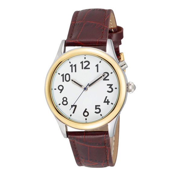 This is a true quality and elegant looking man’s two tone talking watch. While it has only one button, this watch announces the Time, Day and Date, Year, and has an Alarm. Very simple to set and even easier to use.
