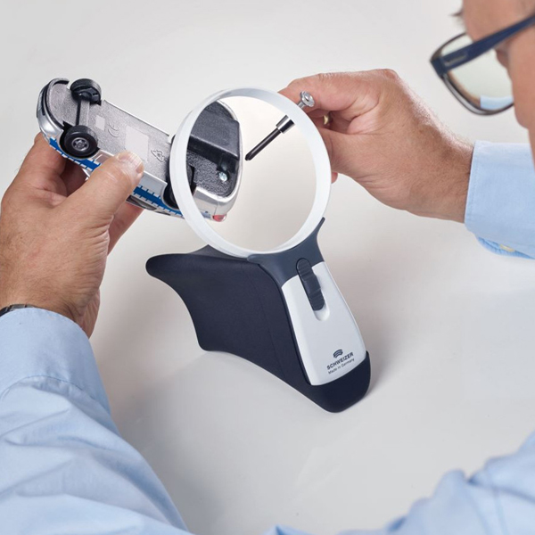 The ERGO mobil base reading and writing stands converts any Schweizer ERGO-Lux MP mobil or ERGO-Lux i mobil hand magnifiers into a stand magnifier without compromising image quality. Snap the pocket ERGO magnifier into the stand, and the exact focal distance is set for the magnification strength of a particular magnifier. This optional mobile base must be purchased for the specific strength of a given magnifier because it sets the working distance for that power. This allows the user to place the magnifier in the stand directly on the reading material, and not struggle to find the correct working distance.