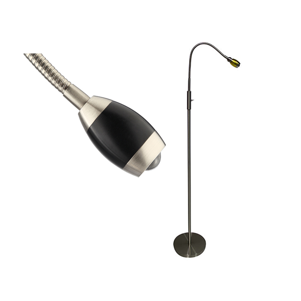 Unique Beam of light adjusts from 3 Inches to 33 Inches. As the beam size reduces, the output increases! Just pull the shade to change. Great lamp! Patent pending design. Anodized Aluminum shade. Floor lamp stands 65 Inch tall. Fully adjustable neck. Handsome black color. Head size 2.75 inches Extra long cord. Very professional looking easy to assemble.