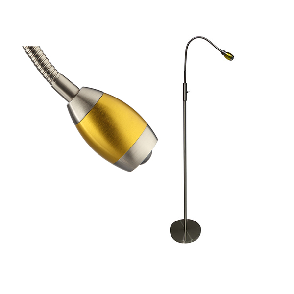 Unique Beam of light adjusts from 3 Inches to 33 Inches. As the beam size reduces, the output increases! Just pull the shade to change. Great lamp! Patent pending design. Anodized Aluminum shade. Floor lamp stands 65 Inch tall Fully adjustable neck. Handsome gold color. Head size 2.75 inches. Extra long cord. Very professional looking and easy to assemble.