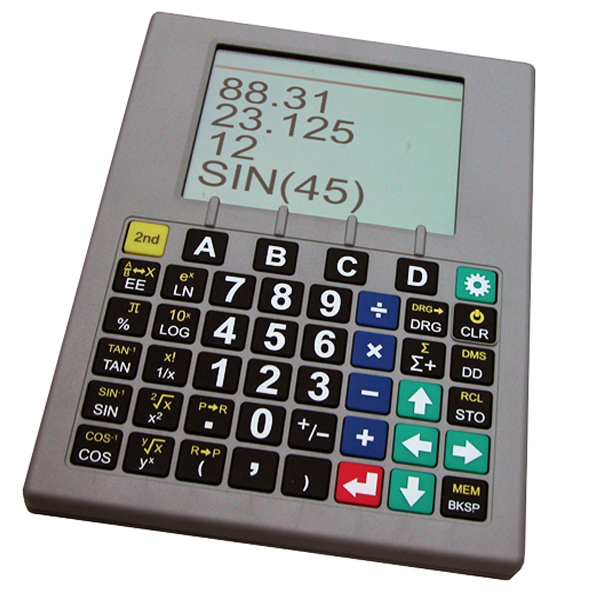 This Sci-Plus Series 3300 is an easy to use, fully portable, talking, large display calculator set in oversized color coded, positively activated keys. The Sci-Plus series 2300 are the only scientific calculators designed specifically for users with low vision. The SciPlus-2300 performs scientific, statistical and trigonometric calculations, and fractions. It also has adds the ability to evaluate functions, and includes a speech output via earbuds (included).