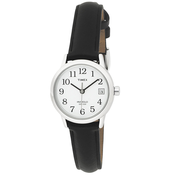 Fashionable for any occasion, the Timex silver-tone stainless steel watch features an easily readable dial with mid Arabic numeral display against a classic white dial background. It offers a mid-sized, round watch case with slightly raised bezel and a supple, genuine leather strap in black. It also features water resistance to 30 meters (99 feet), and date display at 3 o’clock. With the Quick Date function, you can set the date on the watch without turning the crown for every 24-hour period. Just pull the stem halfway out, and turn until desired date is reached.